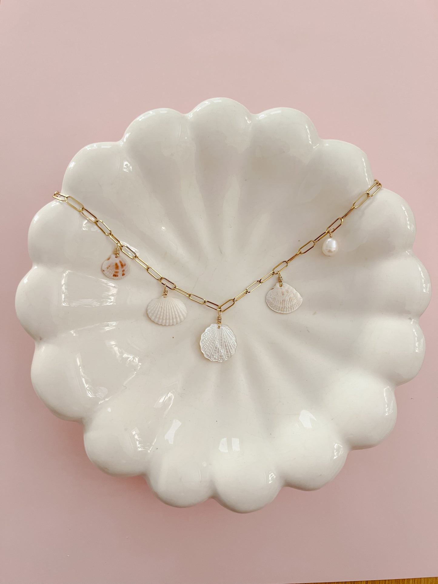 Real Seashell Charm Necklace on a gold stainless steel paper clip chain! Shells, pearl & mother of pearl charms are secured with gold filled wire