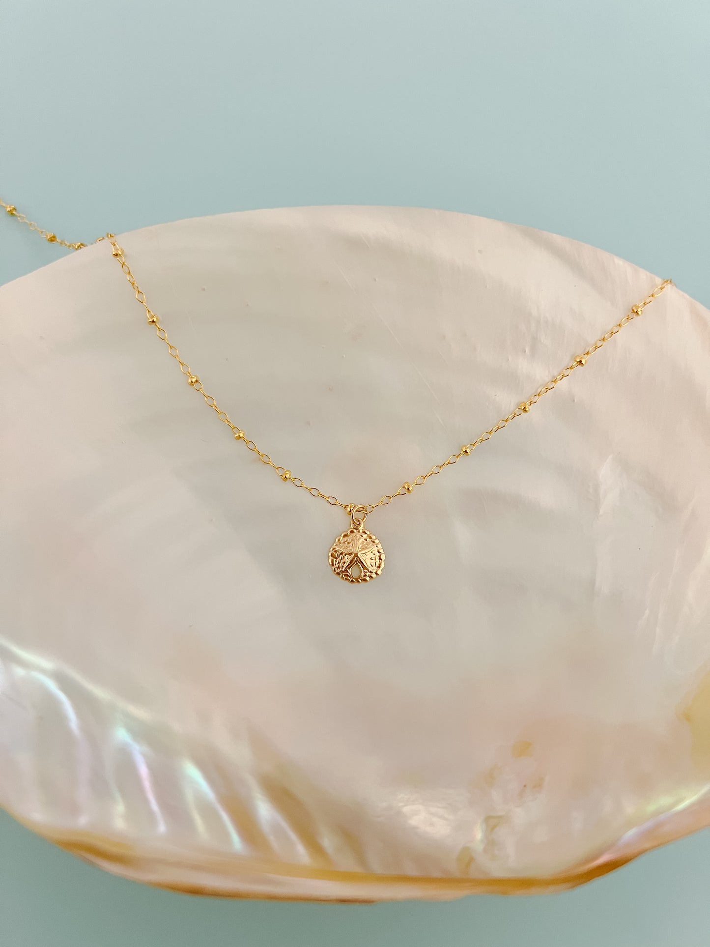 This is for one 14k Gold Filled Sand Dollar Necklace on a dainty 14k gold filled satellite chain! Please select the necklace length you would like