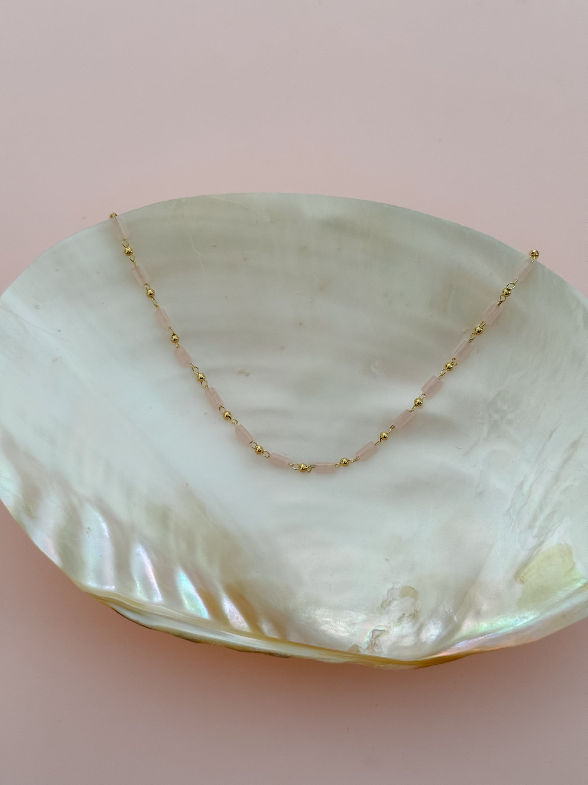 Light pink & gold plated beaded chain necklace- great for layering or by itself! Please select the length you would like