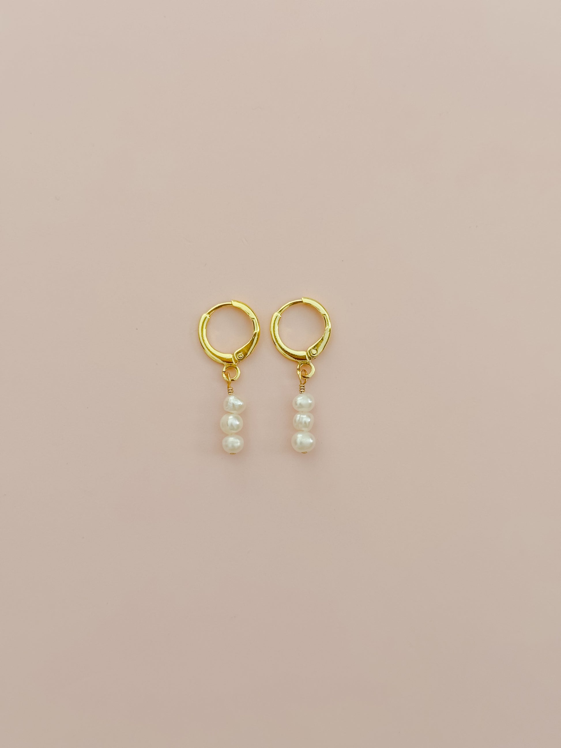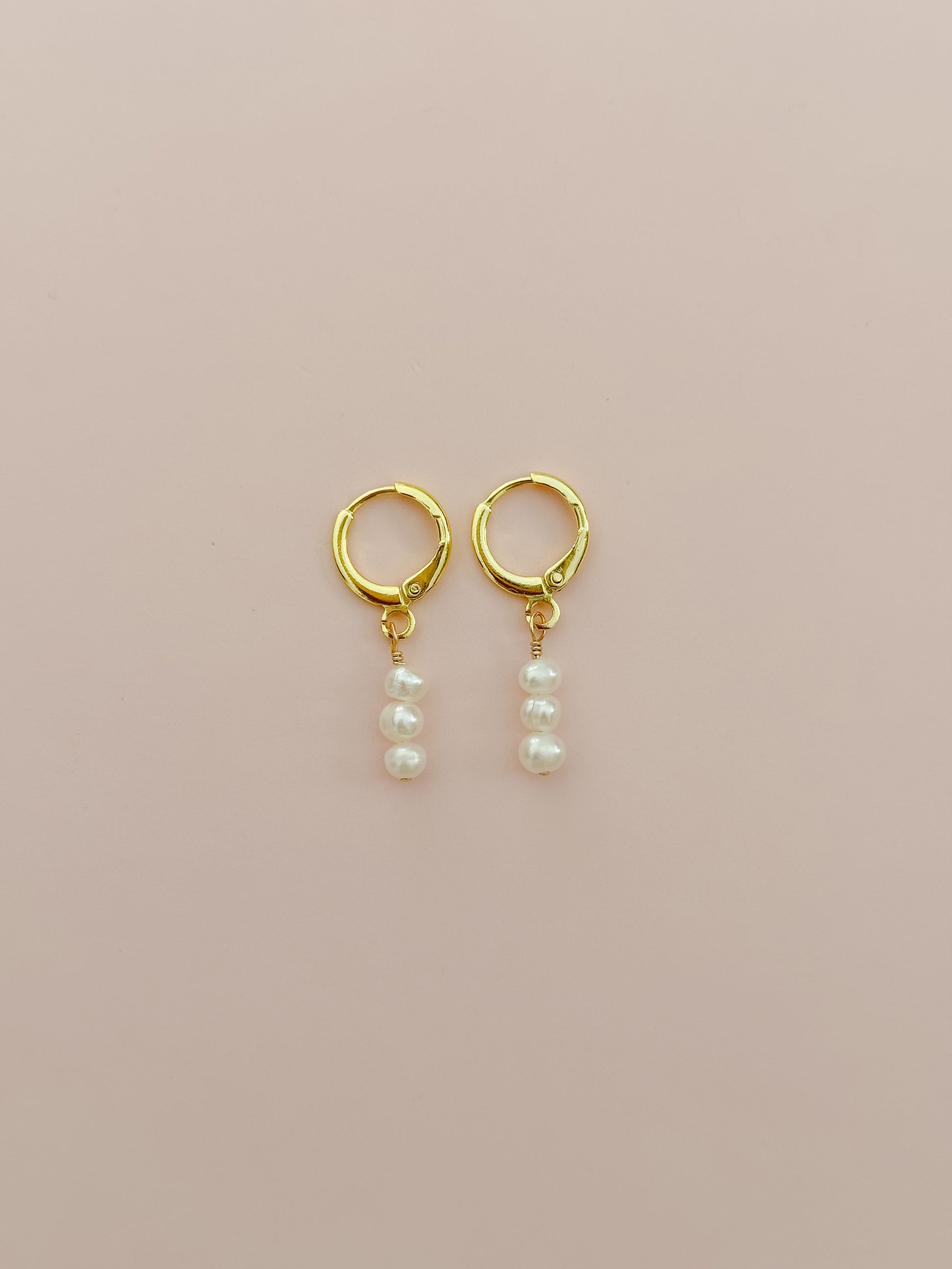 3 small freshwater pearls (0.5” length) on gold plated huggie hoop earring