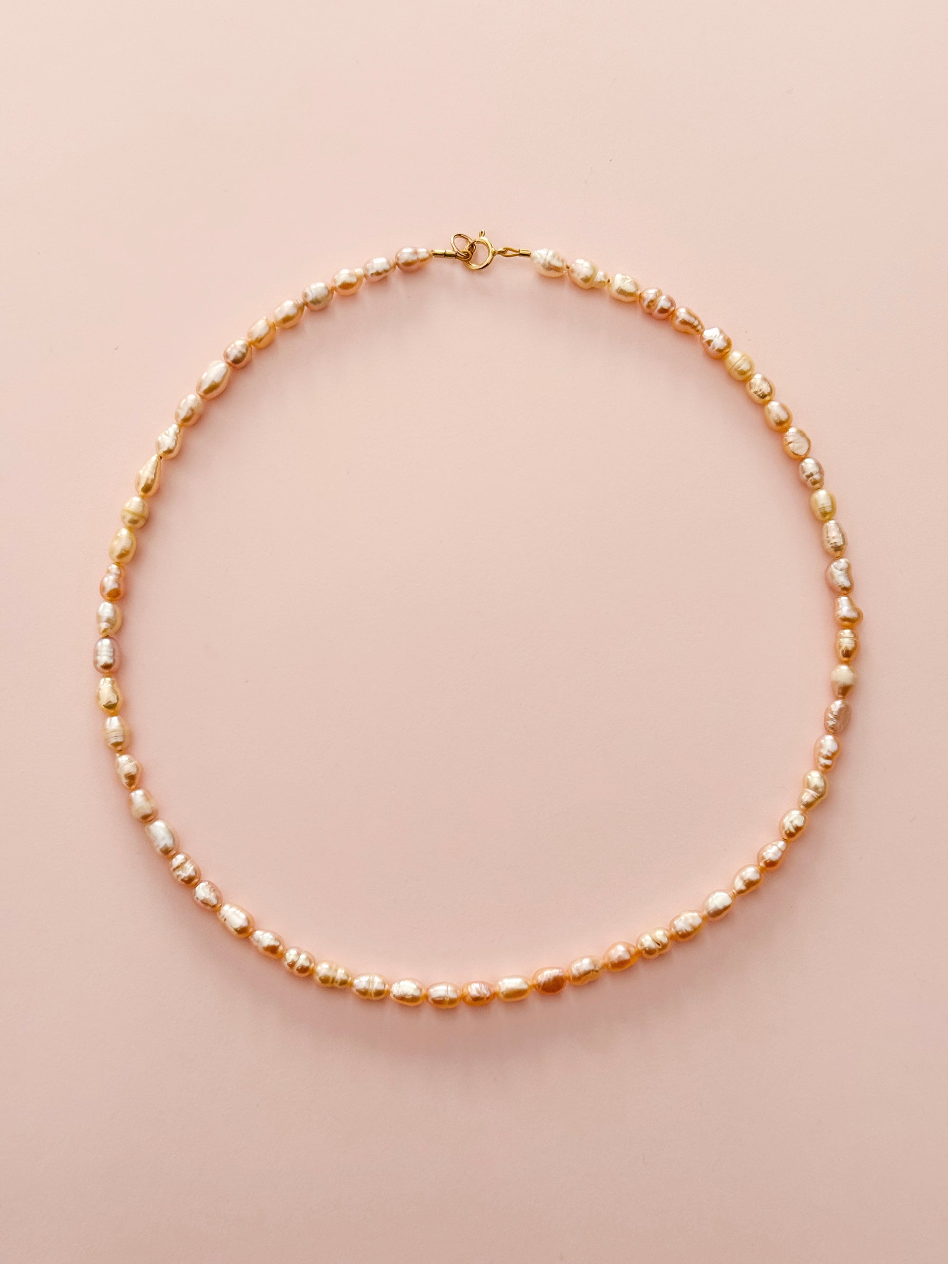 16" necklace of pink freshwater pearls! They have a beautiful peachy pink but also purpely pink sheen to them! Great to wear on it's own or to layer with