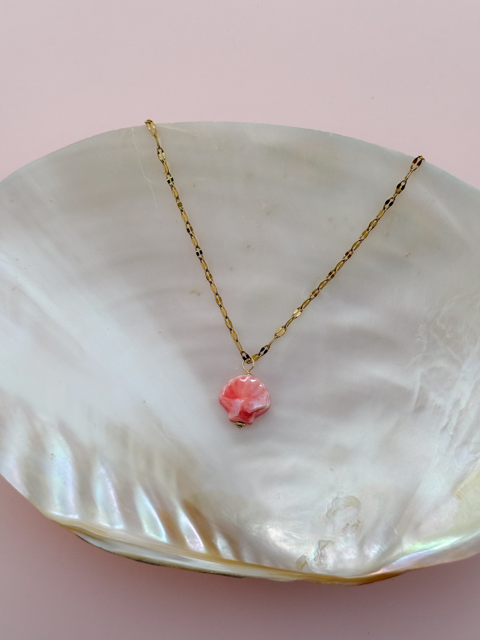Red/pink shell necklace on gold plated stainless steel necklace! Chain is 18" and ceramic shell is 0.5"